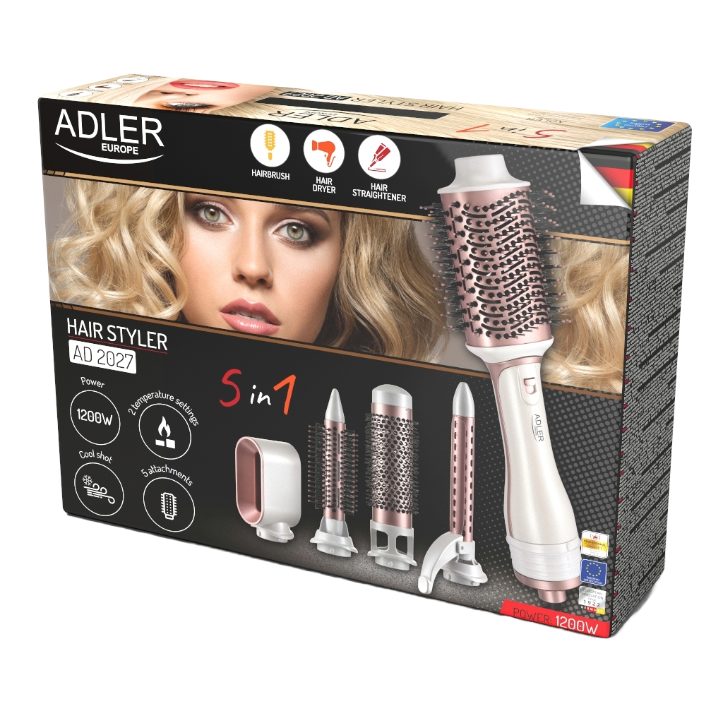 ADLER AD 2027 predstavlja cjelovito rješenje za brzo i praktično stiliziranje kose. Ovaj 5-u-1 profesionalni uređaj objedinjuje funkcije sušenja i oblikovanja, uz mogućnost postizanja različitih stilova – od ravne, zaglađene kose do definisanih lokni i glamuroznog volumena.