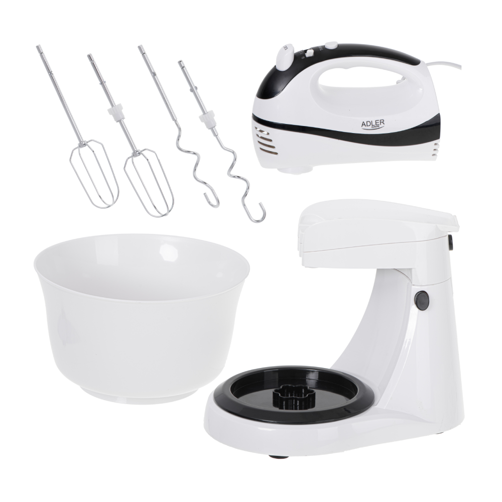 U pakovanju se nalaze 2 nastavka za miješanje i 2 kukice za tijesto, izrađeni od nehrđajućeg čelika, koji osiguravaju dugotrajnost i otpornost na koroziju. Mikser je opremljen plastičnom posudom, laganom i jednostavnom za održavanje.