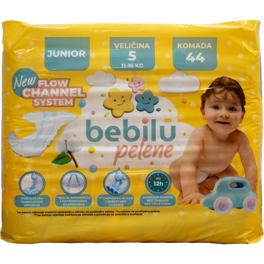 Pakovanje od 44 komada idealno je za kraći period upotrebe ili dopunu zaliha, omogućavajući roditeljima praktično i pouzdano rješenje u svakodnevnoj njezi djeteta. Bebilu 5 Junior pelene pružaju dobar balans između fleksibilnosti, udobnosti i pouzdane zaštite.