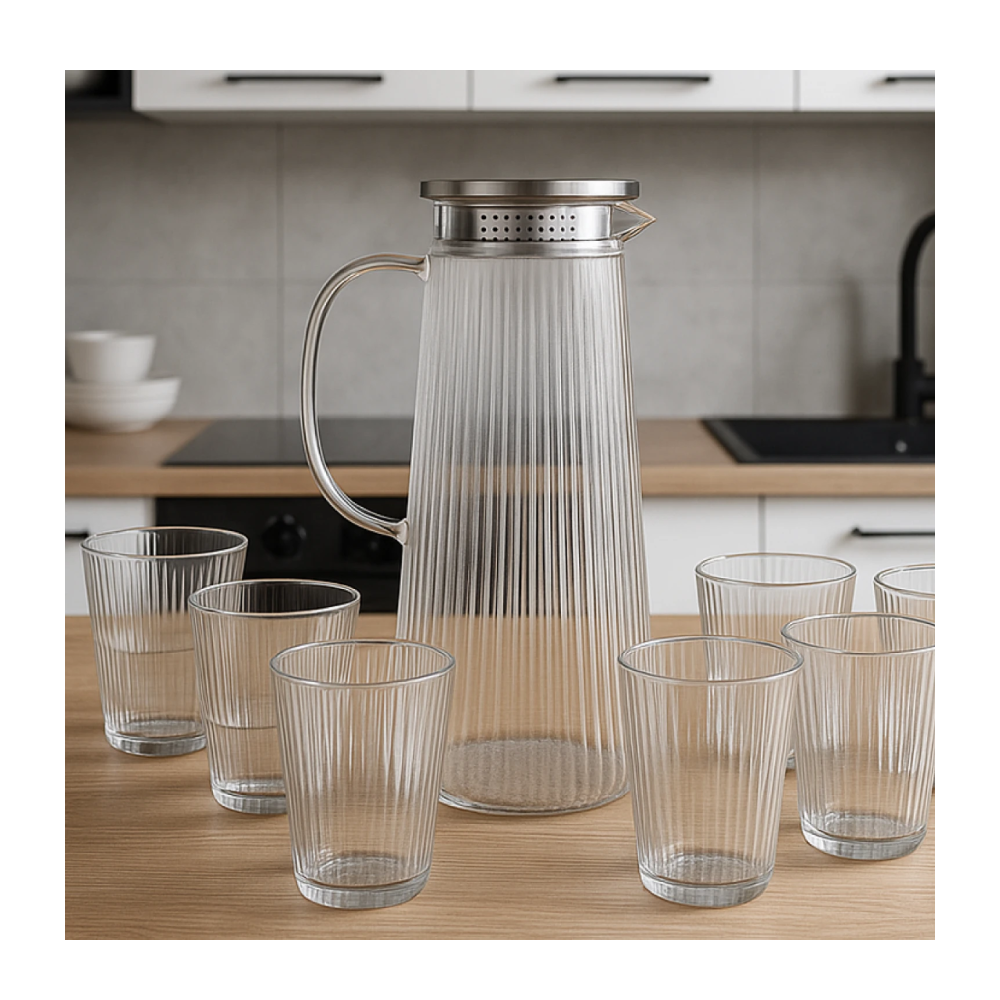 Ovaj set čaša i bokala (7/1) savršen je izbor za svaku priliku – od porodičnih ručkova do svečanih okupljanja. Komplet uključuje jedan bokal i šest čaša, izrađenih od visokokvalitetnog stakla koje osigurava dugotrajnost i lako održavanje. Bokal je praktičan za posluživanje vode, sokova ili domaćih napitaka, dok čaše svojim elegantnim dizajnom pružaju savršen doživljaj serviranja. Moderan izgled uklapa se u svaki stil kuhinje ili ugostiteljskog prostora. Idealno za kućnu upotrebu, restorane i kafiće.