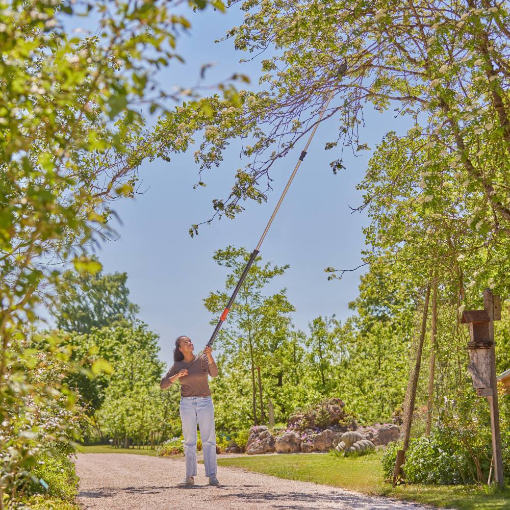 GARDENA StarCut Pro L teleskopske vrtne makaze namijenjene su preciznom i sigurnom orezivanju vrlo visokih grana, bez potrebe za ljestvama. Zahvaljujući teleskopskoj konstrukciji s podesivom dužinom od 175 do 400 cm, omogućavaju rad na granama na ukupnoj visini do približno 6,5 metara, u zavisnosti od visine korisnika i položaja grana.