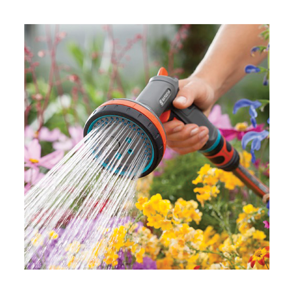 Višenamjenski tuš GARDENA Comfort za sve poslove navodnjavanja i čišćenja s izborom pet različitih načina raspršivanja vode od blagog prskanja, kapljičnog mlaza do punog, plosnatog mlaza za učinkovito čišćenje. Mekane plastične komponente štite glavu tuša od oštećenja. Ergonomsko oblikovana ručka s mekanim plastičnim elementima osigurava maksimalnu udobnost tijekom korištenja. Mogućnosti namještanja mlaza vode su beskonačne. Zaključavanje okidača omogućuje neprekidno zalijevanje bez umaranja zato što nije potrebno cijelo vrijeme držati okidač. Integrirani filter moguće izvaditi i oprati. Višenamjenski tuš Comfort ima integriranu zaštitu od smrzavanja.