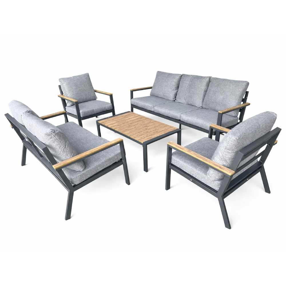 Garnitura Dubai predstavlja elegantno, moderno i izuzetno stabilno rješenje za sve vanjske prostore koji zahtijevaju vrhunski komfor i dugotrajnost. Zahvaljujući aluminijskoj konstrukciji u antracit boji, set odiše luksuzom i minimalizmom, a istovremeno pruža izvanrednu otpornost na vremenske uslove. Prostrani trosjed, udoban dvosjed i fotelja omogućavaju dovoljno sjedećih mjesta za porodicu i prijatelje, dok niski sto savršeno upotpunjuje funkcionalnost cijelog seta.
