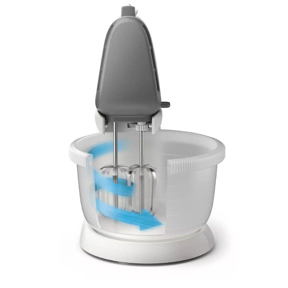 Philips HR3745 ručni mikser sa posudom snage 450 W dizajniran je za brzo, ravnomjerno i jednostavno miješanje sastojaka zahvaljujući kombinaciji snažnog motora i praktične rotirajuće posude od 3 litre. Sa pet brzina i turbo funkcijom, mikser pruža odličnu kontrolu nad teksturom smjese — od laganih krema do gušćih tijesta.