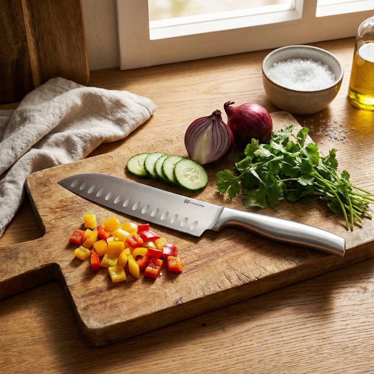 Zahvaljujući izbalansiranom odnosu sječiva i drške, nož leži udobno u ruci, omogućavajući lagano i kontrolisano korištenje čak i tokom dužeg kuhanja. Santoku dizajn, prepoznatljiv po širokoj oštrici i ravnom profilu rezanja, čini ga univerzalnim alatom za sjeckanje povrća, mesa, začina i drugih namirnica.