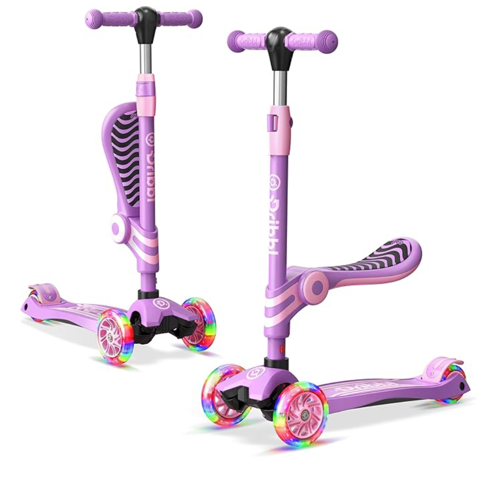 Neon Light Dribbl romobil sa sjedištem pruža djeci zabavnu, sigurnu i vizualno atraktivnu vožnju zahvaljujući LED točkovima koji se aktiviraju pokretom i stvaraju šarene svjetlosne efekte tokom kretanja. Dizajniran je da raste zajedno s djetetom — podesivi T‑bar upravljač nudi četiri visinske pozicije, čineći romobil prikladnim za mališane od 2 godine pa nadalje, uz maksimalnu nosivost do 75 kg (165 lbs).