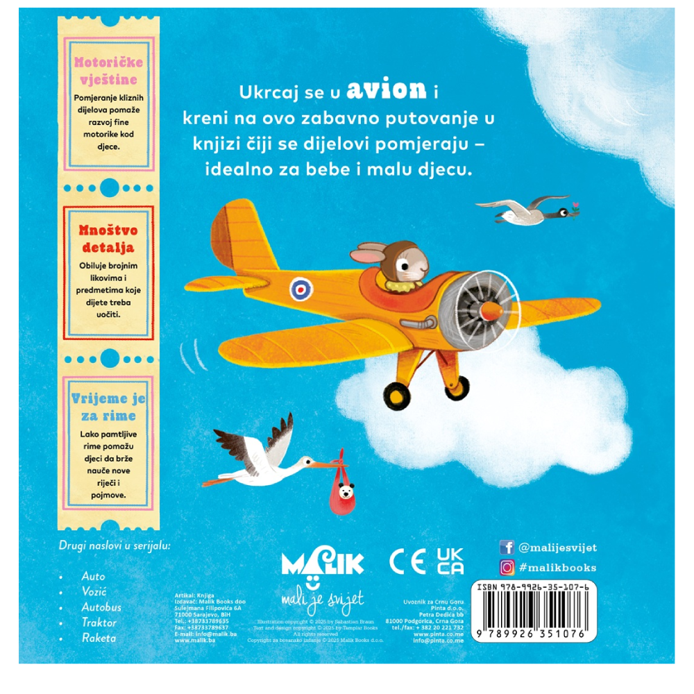 Serijal slikovnica Beba na putu dostupan je u pet razigranih varijanti: avion, traktor, autobus, auto i vozić. Namijenjene djeci uzrasta od 0 do 3 godine, ove slikovnice koriste jarke boje i jednostavne ilustracije kako bi podstakle vizualnu pažnju, rani rječnik i interesovanje za svijet oko sebe.