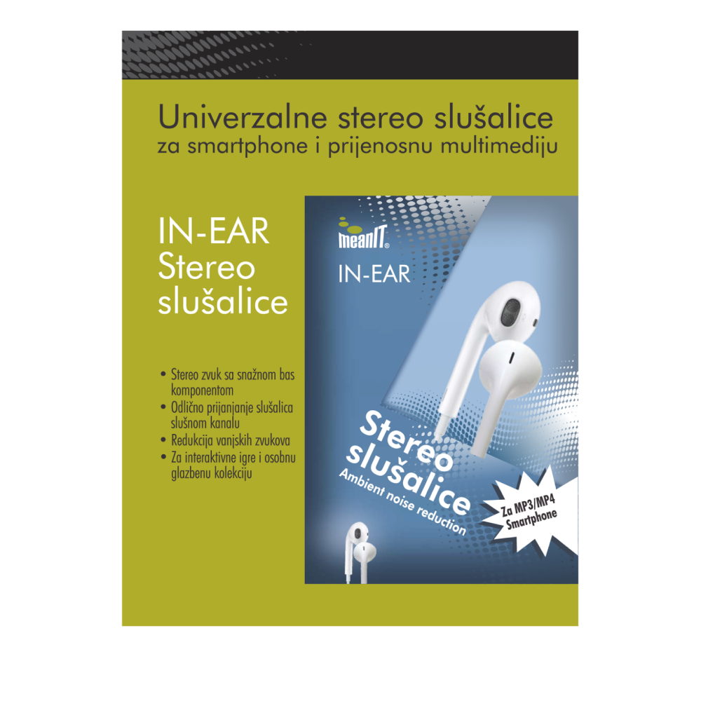 Slušalice MeanIT SLUNI4 nude kvalitetan stereo zvuk u kompaktnoj in‑ear formi. Zahvaljujući dobrom prijanjanju u ušnom kanalu i smanjenju vanjskih šumova, pružaju ugodno iskustvo slušanja muzike, videa i razgovora. Kompatibilne su sa svim uređajima koji imaju 3.5 mm audio ulaz.
