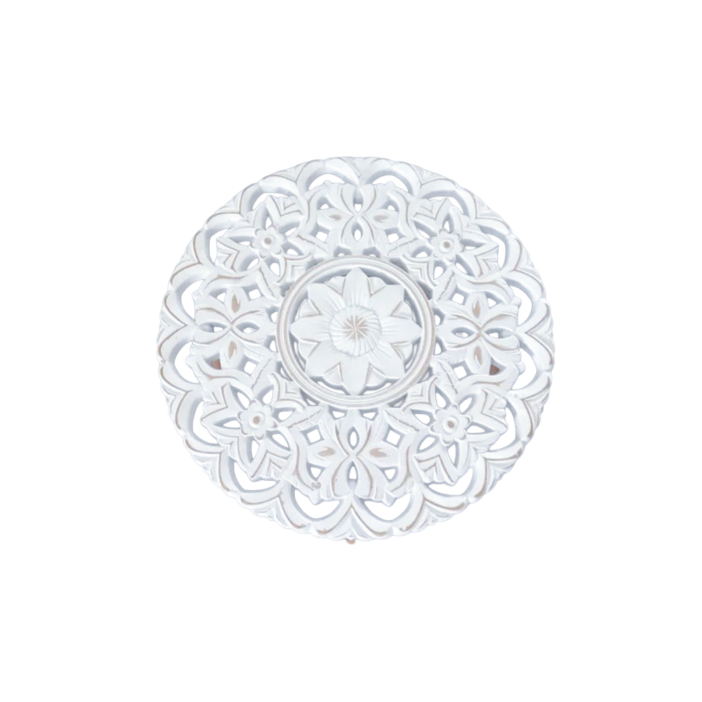 Zahvaljujući većoj dimenziji od 50 cm, ovaj stolić je funkcionalniji i pogodniji za postavljanje većih dekorativnih elemenata, poslužavnika, cvjetnih aranžmana ili svakodnevnih predmeta. Tri čvrste drvene nogice pružaju stabilnost, dok bijelo-rezbarena ploča sa efektom patine savršeno pristaje različitim stilovima uređenja — od modernog i skandinavskog do rustikalnog i boho enterijera.