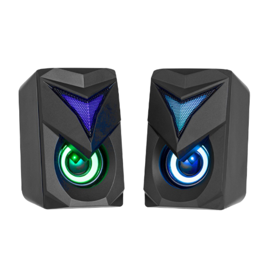 RGB pozadinsko osvjetljenje daje zvučnicima moderan gaming izgled i dodatno upotpunjuje ambijent radnog stola. Povezivanje je jednostavno: zvuk ide preko 3.5 mm audio priključka, dok se napajanje vrši preko USB porta, što omogućava brzu i praktičnu instalaciju bez dodatnih adaptera.